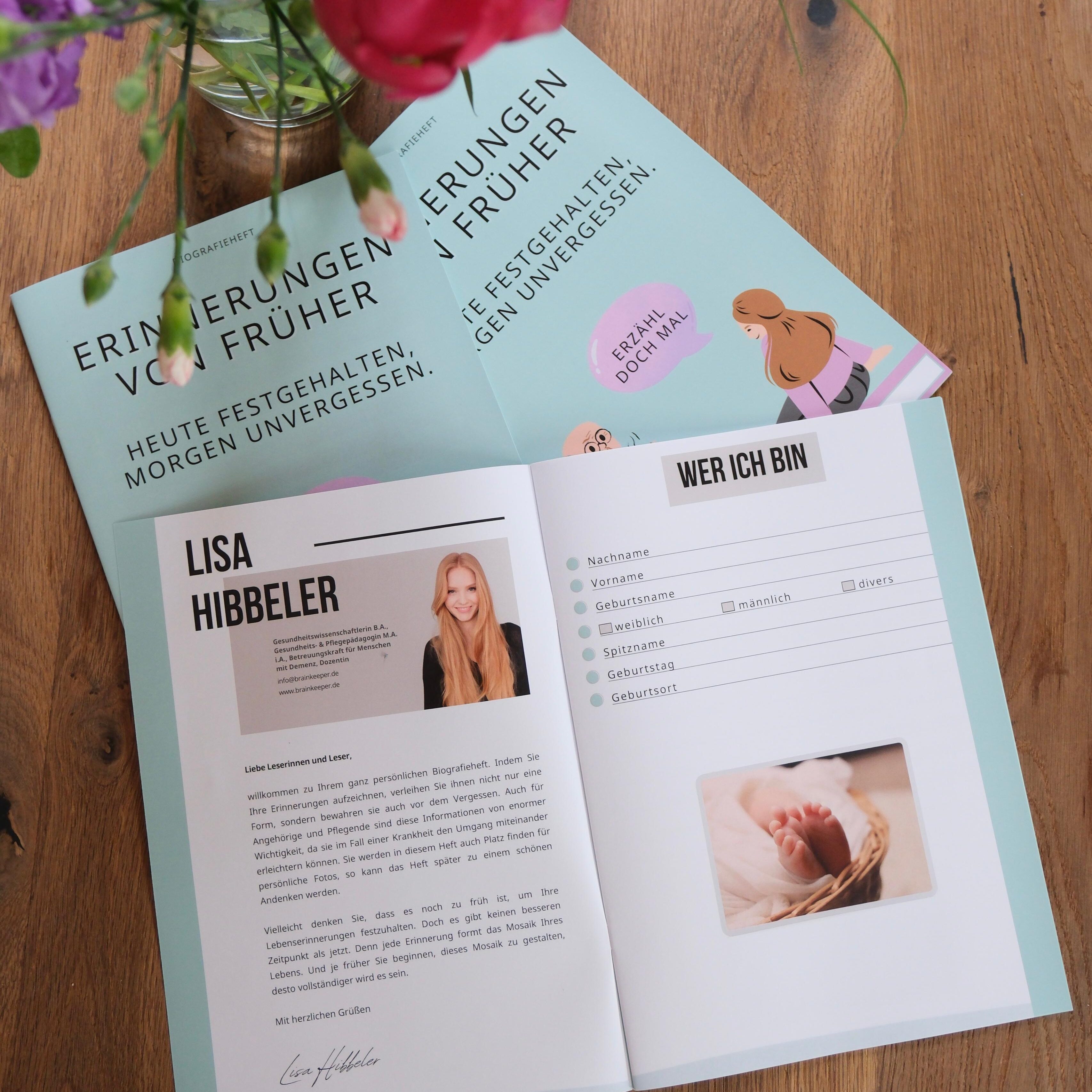 Platz für persönliche Fotos sowie kurze, übersichtliche Eintragungen machen das Biografieheft zu einem wertvollen Erinnerungsstück und zu einer praktischen Unterstützung für Beziehungsgestaltung, Orientierung und den Alltag in Betreuung und Pflege.